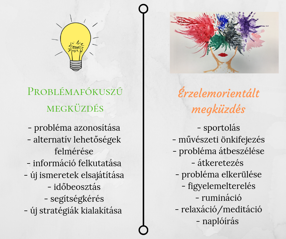 2. Érzelemoriántált megküzdés: Ebben az esetben nem magával a problémával foglalkozunk, hanem az általa kiváltott negatív érzelmeinket próbáljuk kezelni. Fontos, hogy ezek a megoldási lehetőségek rövid távon hasznosíthatóak, hosszú távon szükség van az imént felsoroltak alkalmazására is! -sportolás: már egy alacsony intenzitású, rövid séta is javítja a hangulatot, segít elterelni a gondolatokat. Az intenzívebb testmozgás pedig a felgyülemlett feszültség oldásához járulhat hozzá. - művészeti önkifejezés: ide tartozhat a rajzolás, festés, bármilyen kreatív tevékenység - probléma átbeszélése: a barátokkal történő beszélgetés szintén csökkentheti a feszültséget és segíthet az érzelmek megfogalmazásában, strukturálásában - átkeretezés: a probléma átfogalmazása, más aspektusból történő megközelítése: „A gyermekem nem akaratos, hanem kitartó.” - probléma elkerülése: a feszültség csökkentése érdekében rövid ideig adaptív lehet, ha nem kell újra szembesülnünk az adott problémával, helyzettel - figyelemelterelés: szintén a kellemetlen érzéssel való szembesülést, munkát tudjuk késleltetni azzal, ha eltereljük a figyelmünket; ilyen lehet az olvasás, filmnézés vagy a problémától független más tevékenység megkezdése - rumináció=rágódás: a probléma újbóli átgondolása, elemzése eleinte hasznosnak, értelemtelinek tűnhet, azonban túlzott ismétlése a feszültség növeléséhez és a tehetetlenség érzésének erősödéséhez járul hozzá - relaxáció/meditáció: hozzájárul a testi-lelki nyugalom megteremtéséhez, hosszútávú pozitív hatásai lehetnek fizikai és pszichológiai egészségünkre - naplóírás: hasonló a szerepe, mint a barátokkal való beszélgetésnek; segít kiadni magunkból az érzéseket, gondolatokat és lehetőséget ad ezek rendszerezésére is